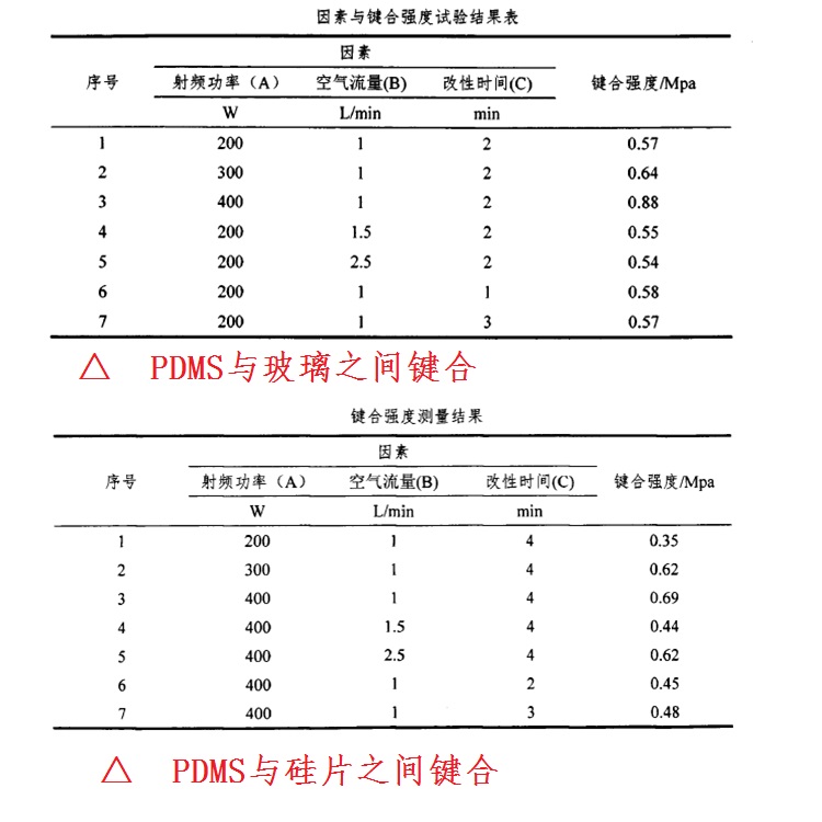 等離子表面處理在PDMS不可逆鍵合前,特別是PDMS同質異質不可逆鍵合時的工藝參數,都有可能產生交互式影響。